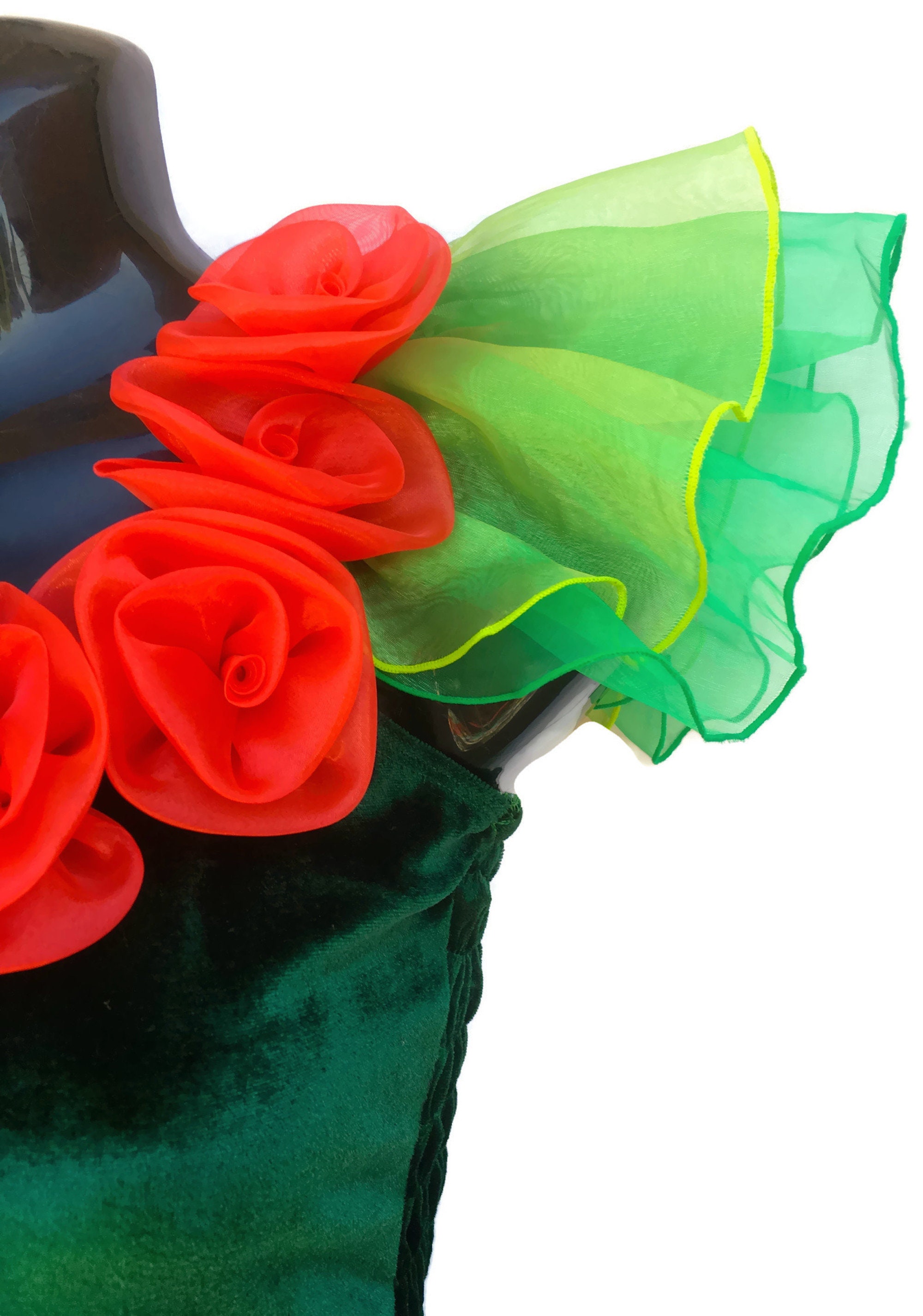 Our beautiful Adult Fairy Dress has a velvet bodice that is ruched at the back for comfort and fit.A beautiful organza and soft tulle skirt with loads of green organza coloured petals and a satin underskirt for sensitive legs.Red coloured rosettes around the waist and bodice with layers of organza trimming on the shoulders.